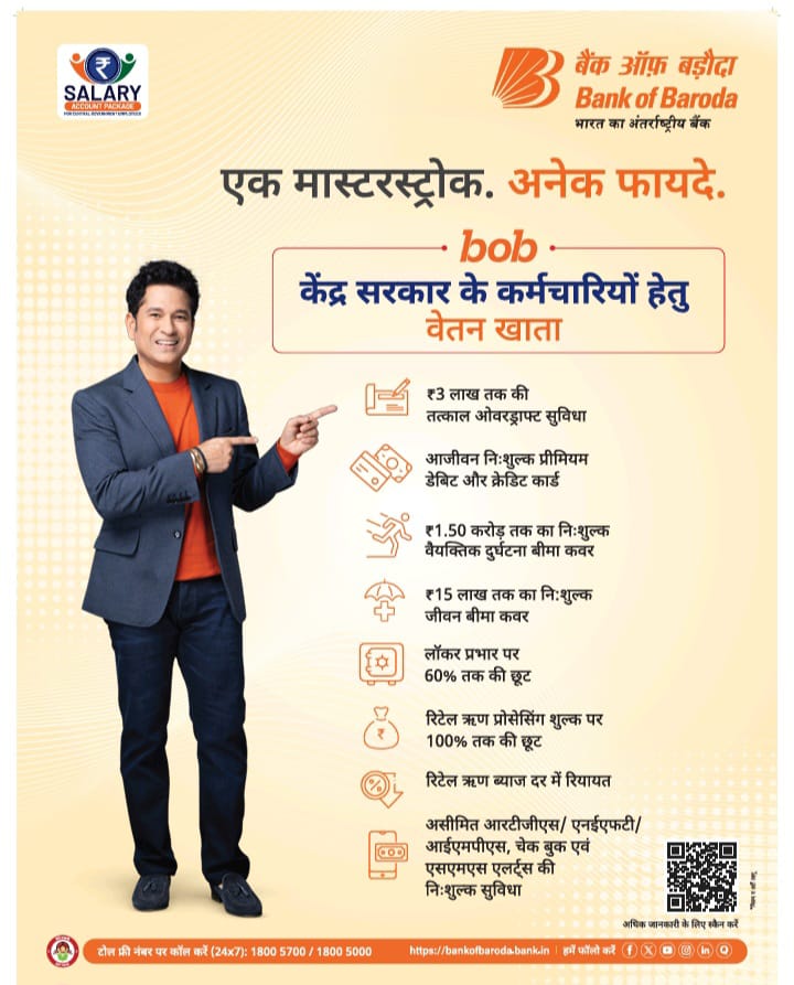 भारत के अग्रणी सार्वजनिक क्षेत्र के बैंकों में से एक, बैंक ऑफ़ बड़ौदा ने वित्तीय सेवा विभाग (DFS) की पहल के अंतर्गत केंद्रीय सरकारी कर्मचारियों के लिए ‘बॉब सेंट्रल गवर्नमेंट एम्प्लॉइज़ सैलरी अकाउंट’ की शुरुआत की है। इस विशेष सैलरी अकाउंट पैकेज का अनावरण DFS सचिव श्री एम. नागराजू द्वारा किया गया। यह एक सिंगल-विंडो बैंकिंग समाधान है, जिसमें उन्नत सैलरी अकाउंट सुविधाएं, व्यापक बीमा कवरेज तथा प्रीमियम कार्ड लाभ शामिल हैं।