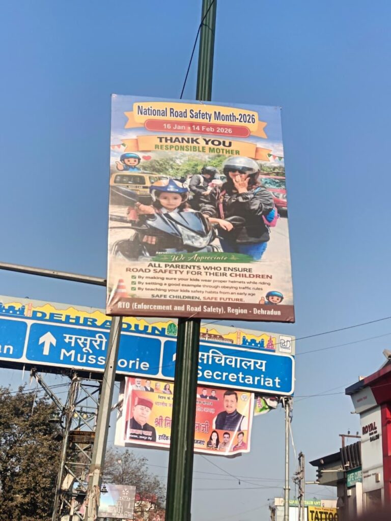 सड़क सुरक्षा माह के अंतर्गत देहरादून शहर के प्रमुख मार्गों पर जनजागरूकता बैनर एवं पोस्टर लगाए गए हैं, जिनमें आमजन को विभिन्न सड़क सुरक्षा संदेशों के प्रति जागरूक किया जा रहा है, जैसे— शराब पीकर वाहन न चलाएँ (ड्रिंक एंड ड्राइव नहीं), ट्रिपल राइडिंग न करें, राइडर एवं पिलियन दोनों हेलमेट पहनें, वाहन में सभी यात्री सीट बेल्ट लगाएँ, रेड लाइट पर अवश्य रुकें/रेड लाइट जंप न करें, एम्बुलेंस को रास्ता दें, तथा यातायात नियमों का पालन करें। साथ ही किशोर द्वारा वाहन चलाने (Juvenile Driving) के संबंध में मोटर वाहन अधिनियम की धारा 199A के तहत विशेष जागरूकता संदेश भी प्रसारित किए जा रहे हैं।